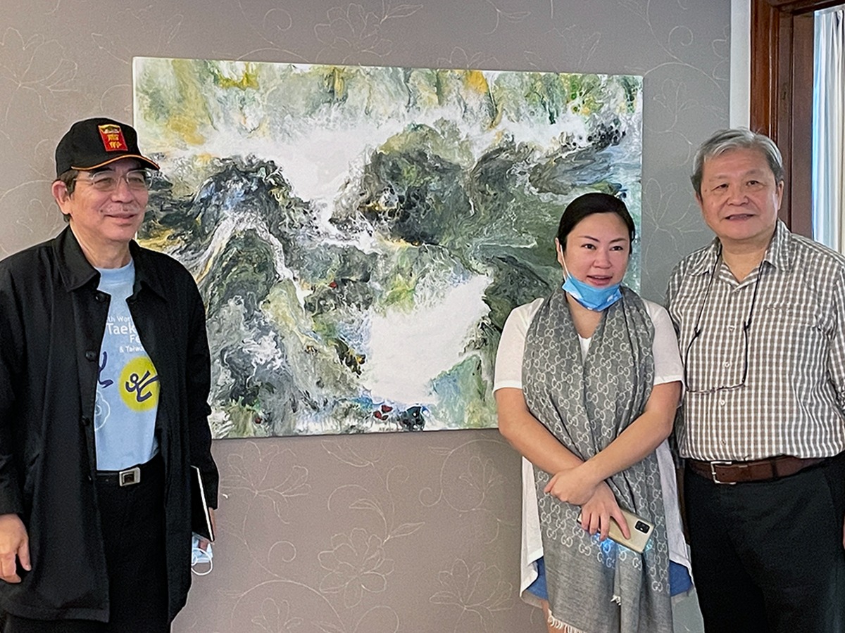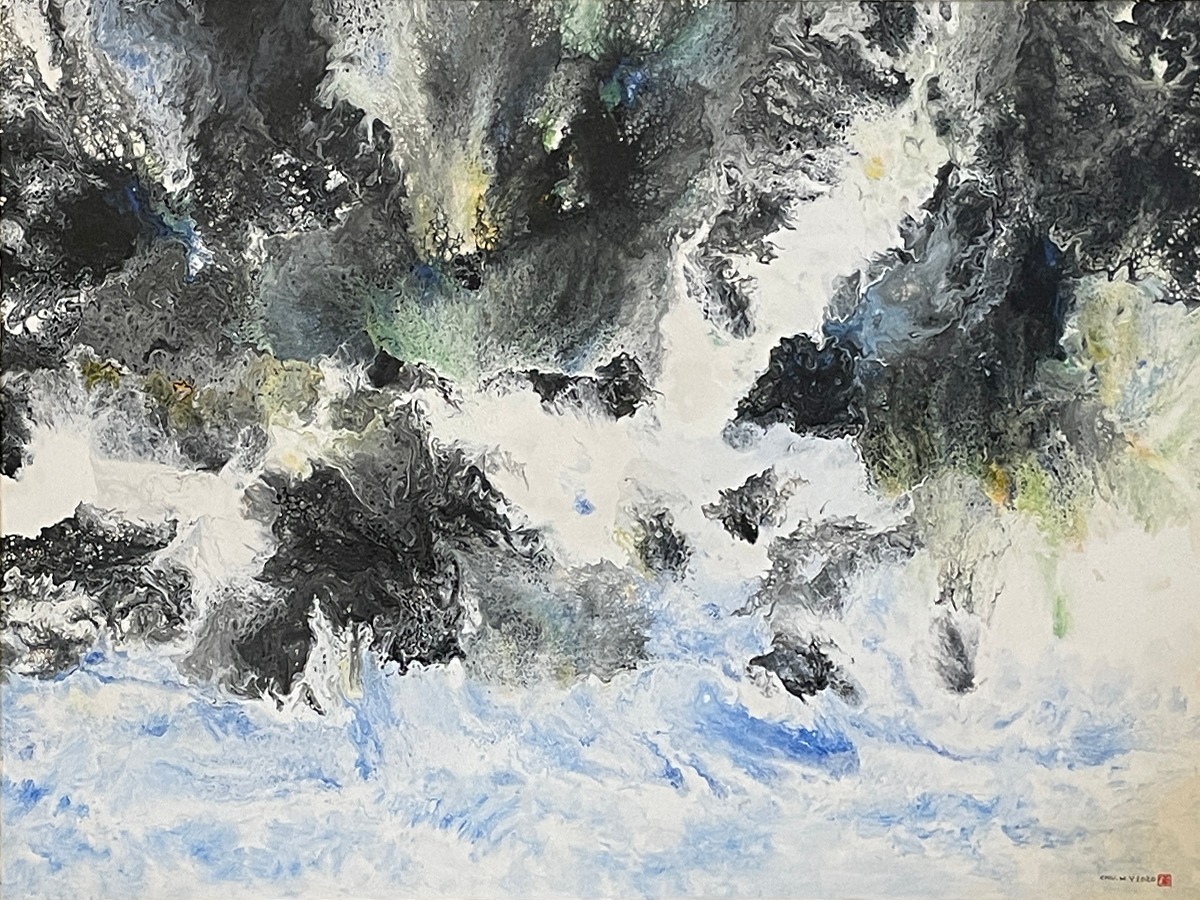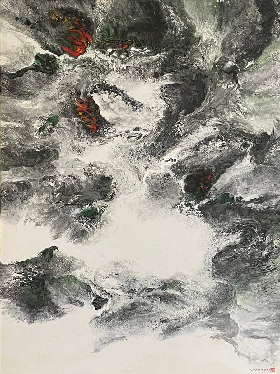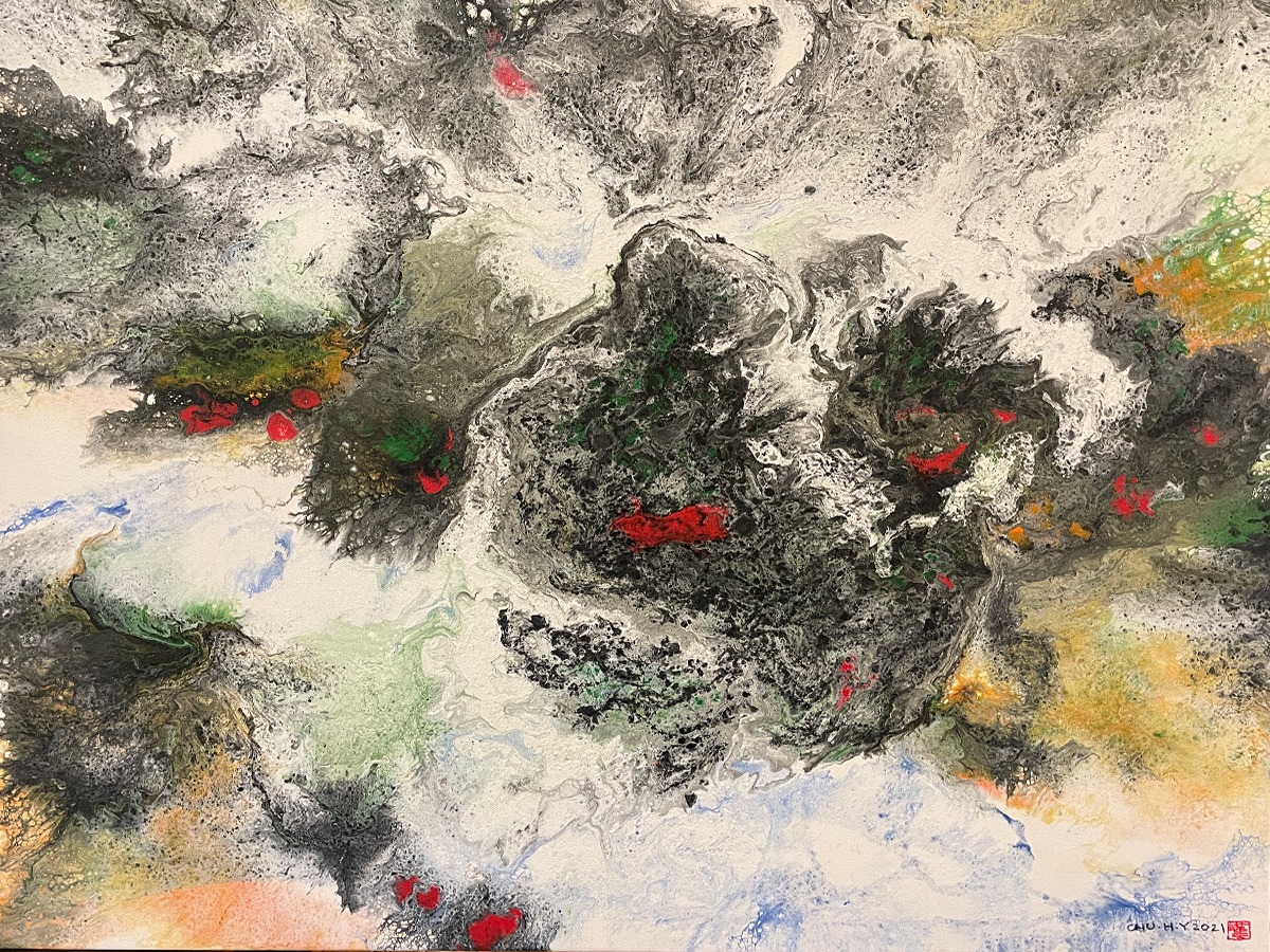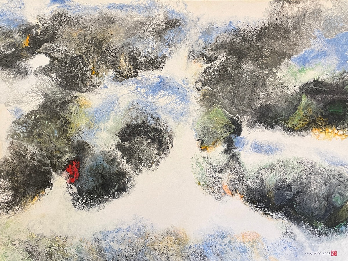 運用新的媒材和獨創的技法,在畫面上呈現了無數靈動飛舞的線條,與鮮明華麗的色彩相互依存昇華,超凡脫俗,卓然不群。「不求形似」、「聊寫胸中逸氣」卻又神采飛揚,實乃巧奪天工,讓人無法捉摸而達到天人合一的境界,靈氣迫人,畫已臻空靈的妙境。