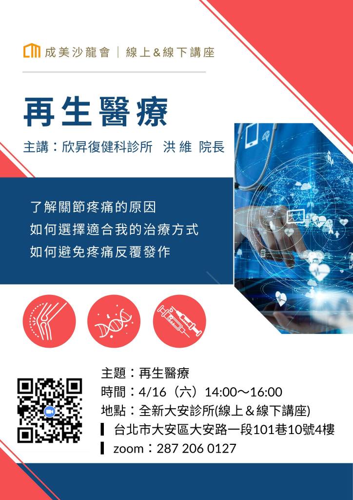 成美沙龍會-再生醫療 分類:成美健康集團-2022 年 4 月 22 日2022 年 5 月 13 日發表於3 近期活動,沙龍會 #成美沙龍會#關節#復健「關節疼痛」是許多人生活上常見的問題,尤其隨著年紀增長會愈發明顯 不過!這不一定與身體機能退化有關喔!許多甚至壯年人士,就有出現關節疼痛的情形… 本週六 成美沙龍會,邀請到「欣昇復健科診所 洪維院長」,為大家講解:關節疼痛的原因,並且帶大家一起認識適合的治療方式與如何避免疼痛反復發作。 ▌主題:再生醫療▌主講:欣昇復健科診所 洪維院長▌時間:4/16(六)14:00-16:00▌主辦單位:成美健康集團 分享此文: 分享到 X(在新視窗中開啟) X 分享到 Facebook(在新視窗中開啟) Facebook 喜歡 正在載入... 相關