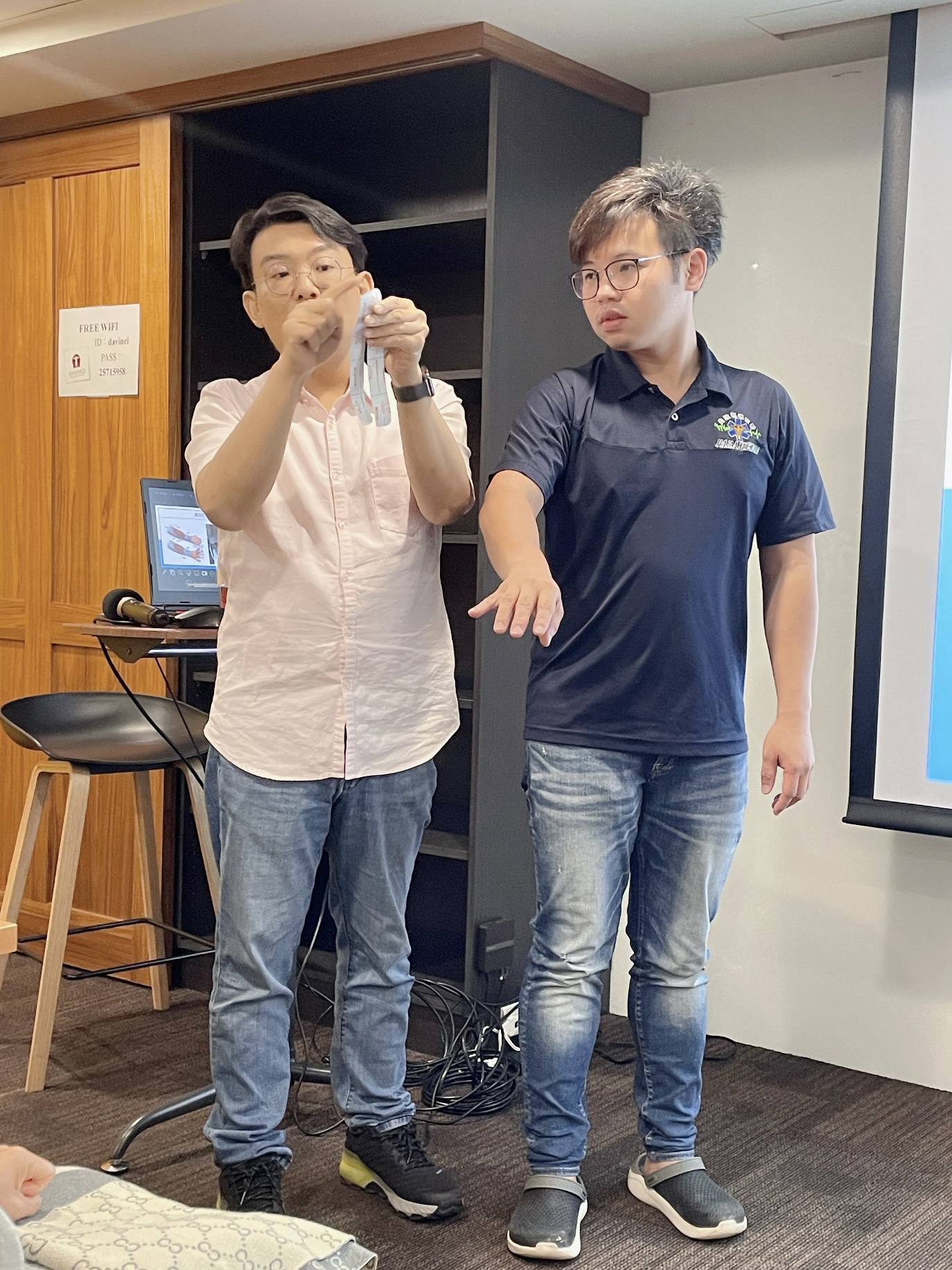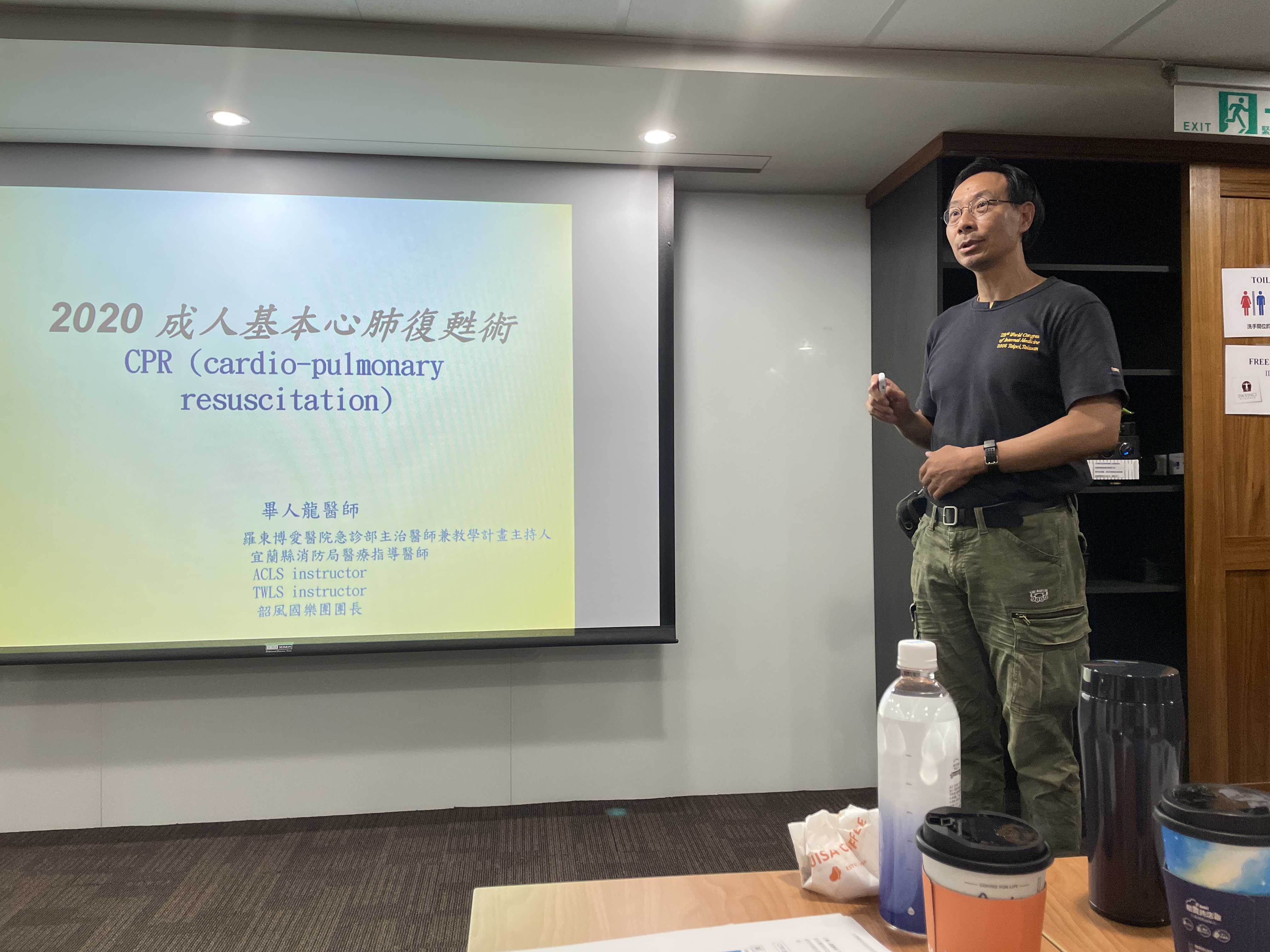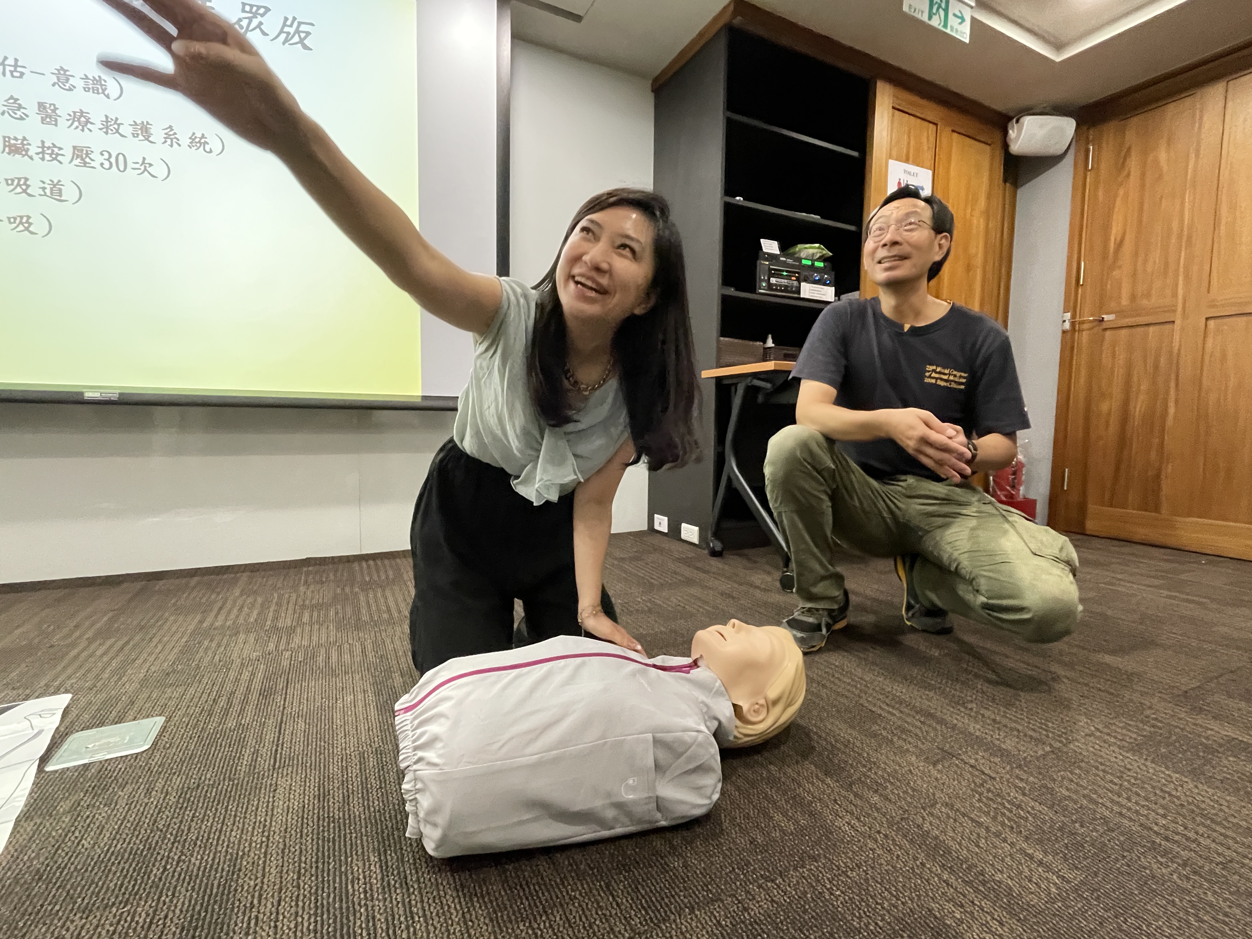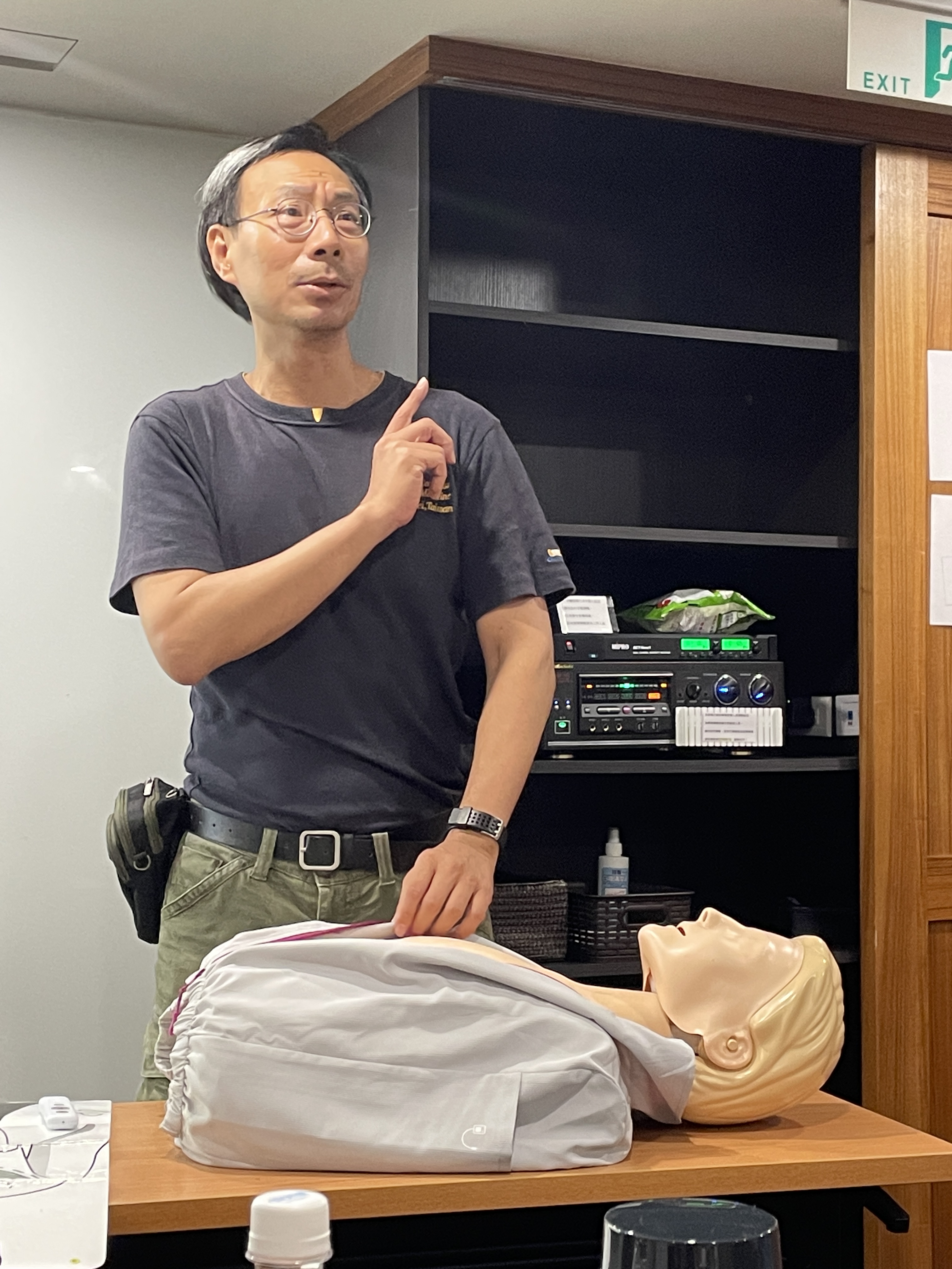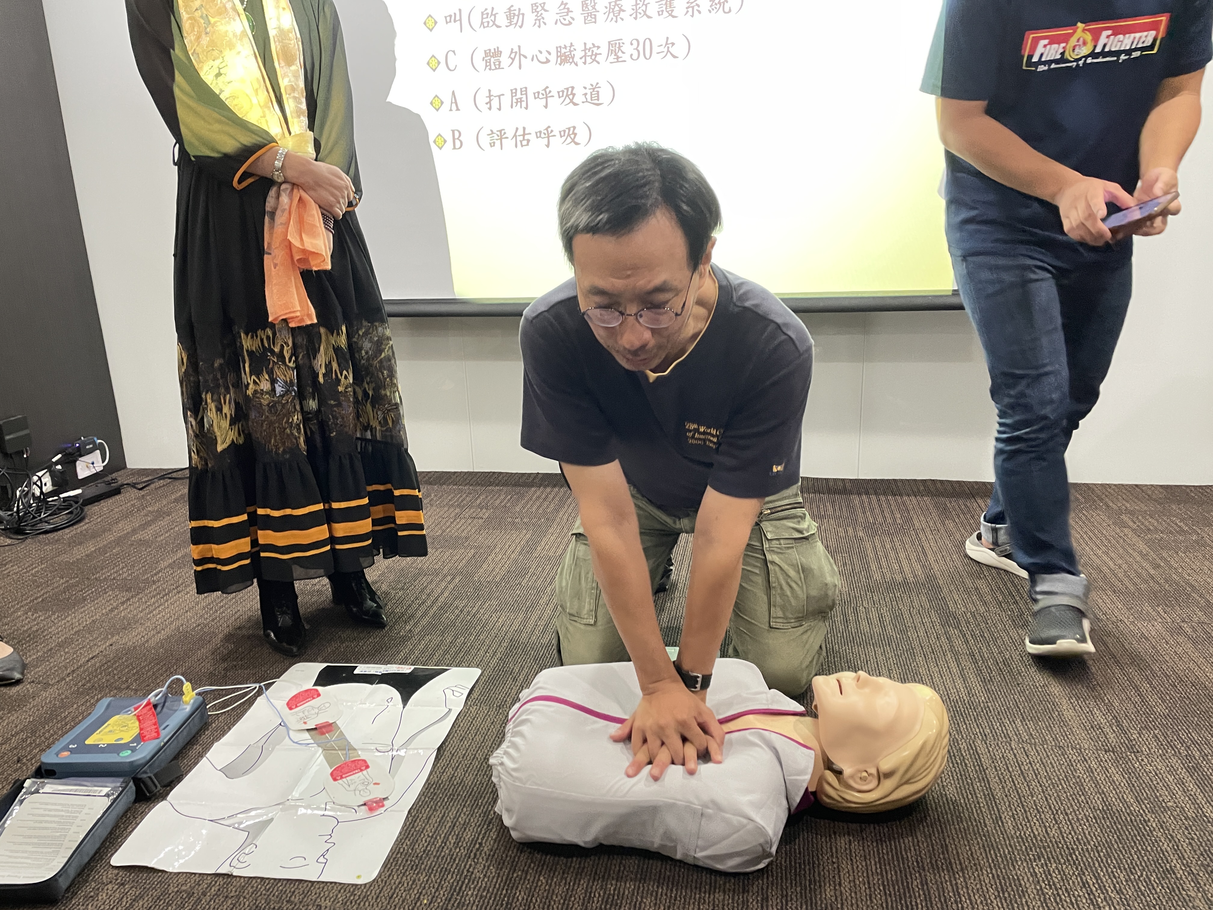 首先,畢人龍醫師向我們介紹了急救教育訓練的重要性,尤其是心肺復甦術(CPR)和自動體外心臟電擊去顫器(AED)。他深入講解了這些急救技術的原理,並透過示範教學和實際操作演練,讓我們學習到如何正確實施心肺復甦術(CPR)和使用AED。經由實作演練過程,提升了對急救技能的掌握度,也讓學員們更有信心在必要時刻可以幫助他人。